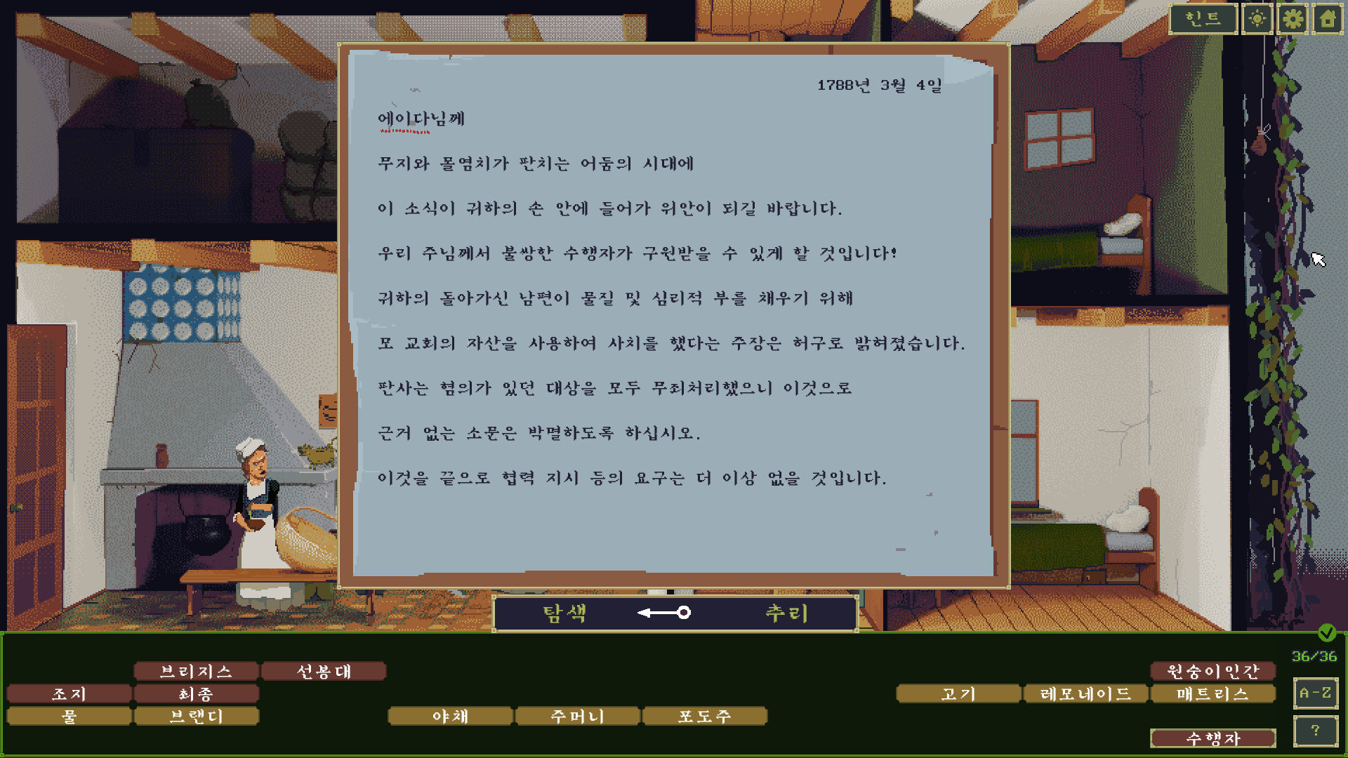 최대한 추리에 무리가 없도록 번역에 신경을 쓰긴했지만 아무래도 국내 플레이어들은 게임의 시대나 배경, 문화에 대한 지식이 깊지 않기때문에 이런 부분은 번역으로 커버를 할 수가 없어서 아쉬웠다.