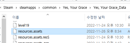 3. Yes, Your Grace_Data > resources.assets 파일을 다운받은 패치파일과 교체