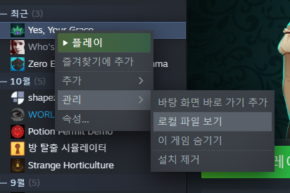 2. 스팀 라이브러리 > Yes, Your Grace 우클릭 > 관리 > 로컬 파일 보기